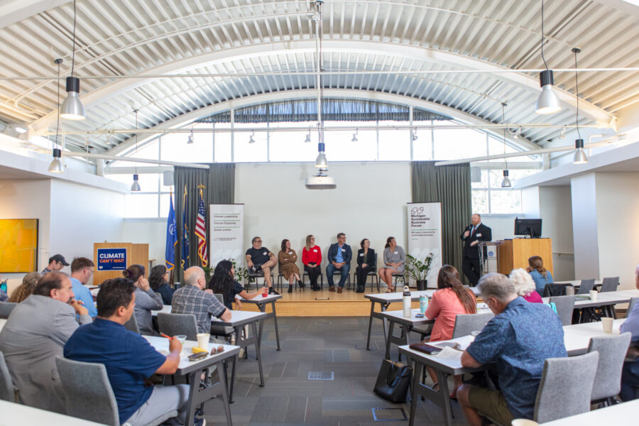El miércoles 17 de septiembre, los asistentes se reunieron en el Muskegon Innovation Hub para escuchar a funcionarios públicos y líderes empresariales sobre el estado de la acción climática en el Lakeshore Climate Forum del Michigan Sustainable Business Forum.